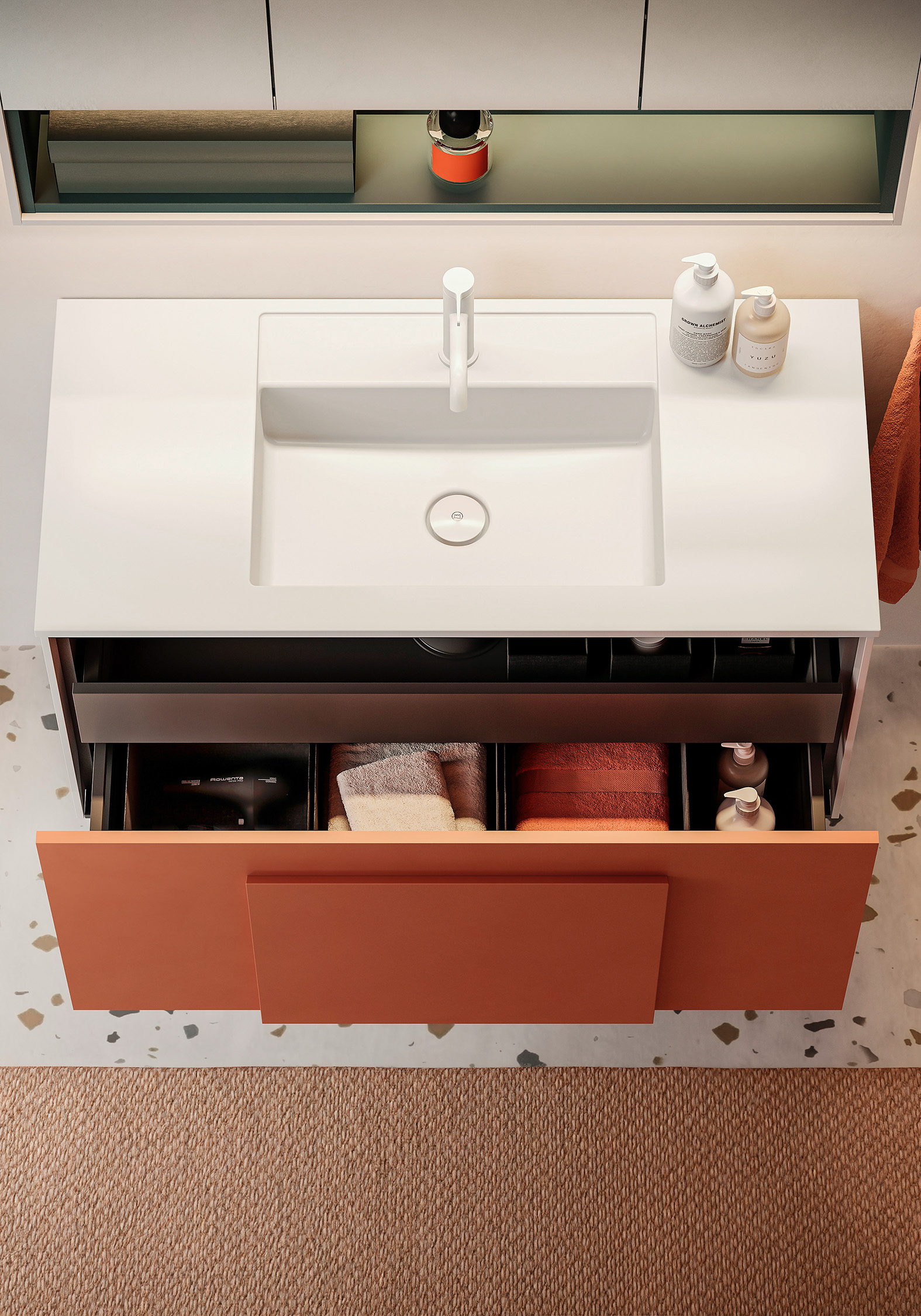 Moto ist purer Minimalismus und reine Farbe, eingefasst von einem schlichten Korpus und kombiniert mit einem wie ausgestanzt wirkenden Waschtisch. Das Design ist ein Spiel von geometrischen Formen, deren Flächen und Volumen wie Echos aufeinander zu antworten scheinen und dem Raum Klarheit, Ordnung und Komposition verleihen. Die Badmöbel der von Studio Altherr Désile Park für burgbad entworfenen Kollektion gehen eine enge Verbindung mit der Architektur ein und wirken durch ihre Farbgebung auf ihn zurück: Je nach Farbwahl lassen sie ihn warm, frisch, energiegeladen oder zart leuchten. Der mattweiß lackierte Korpus bildet dabei die Verbindung zwischen Architektur und Farbe – ein weißer Rahmen, der dem Holzton, der monochromen Farbe, dem Farbklang Strahlkraft verleiht.